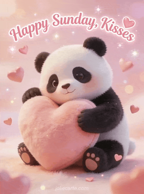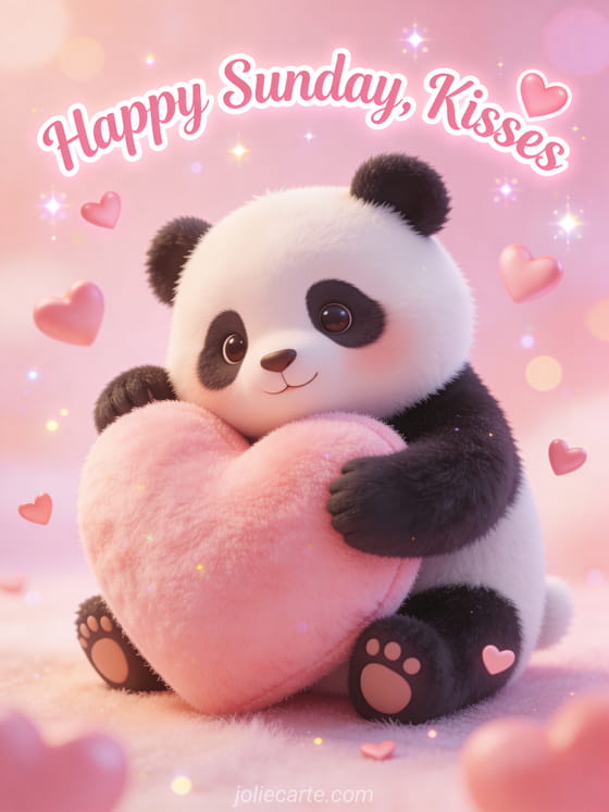Share a tender Sunday greeting with an adorable cartoon panda hugging a giant heart plushie, floating hearts, and soft pastel pink light. Discover also message happy sunday or beautiful happy Sunday kisses images.