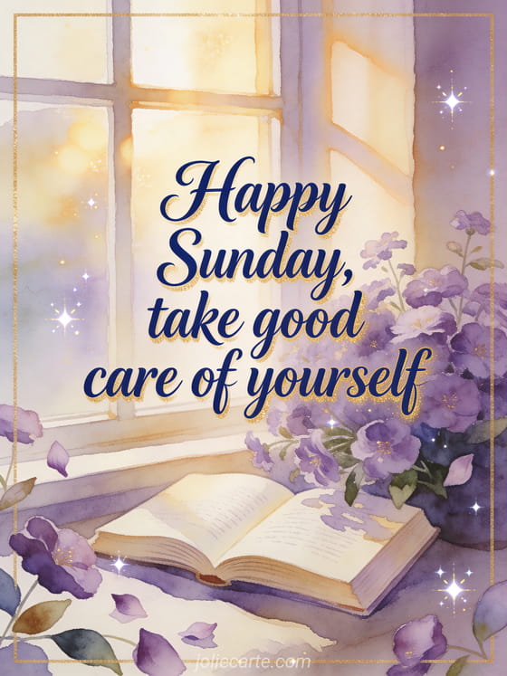 Send happy Sunday, take good care of yourself with a gentle watercolor reading nook, an open book near violet flowers, and a warm window glow. You can also share a coffee happy Sunday friendship image, pretty happy Sunday cards, or beautiful animated happy Sunday images.