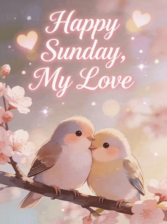 Share a romantic Sunday greeting with two adorable lovebirds cuddling on a branch, cherry blossoms, and heart-shaped light. Discover also a happy Sunday animated card or animated ladybug happy Sunday gifs.