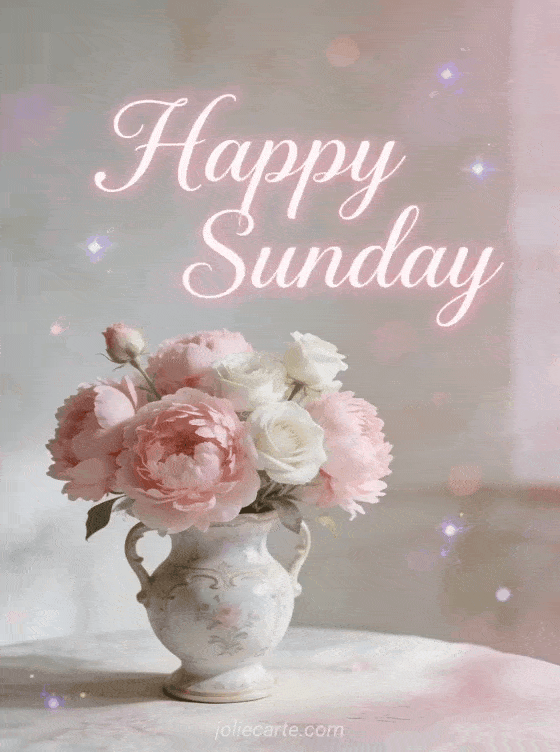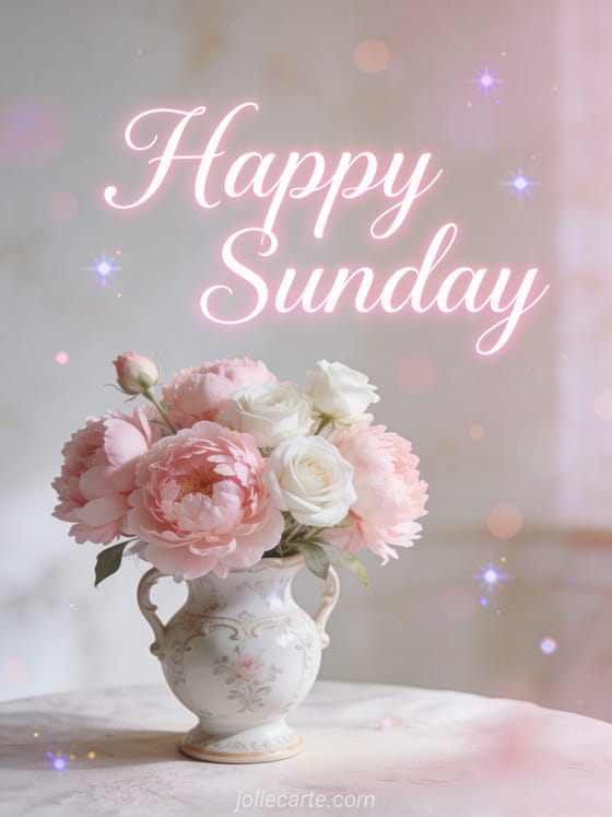 Share romance with this happy sunday card featuring a delicate arrangement of pink peonies and white roses in a vintage porcelain vase in soft morning light. Discover also a photos to wish a happy Sunday or a happy sunday cocooning card.