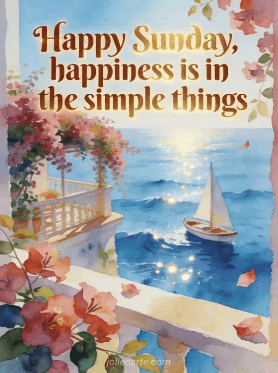 Share a bright Sunday thought with chestnut lettering, a small sailboat on blue water, a terrace covered with bougainvillea and sunlight glittering on the waves. Discover also a happy sunday dogs image, an animated virtual happy sunday card or a Sunday kisses gif.