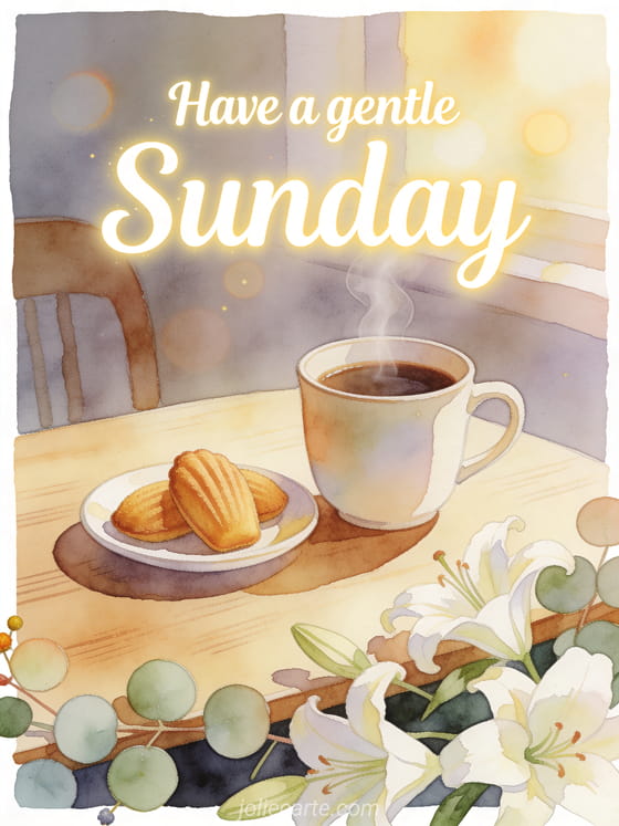 Share a soft happy Sunday card with a steaming coffee cup, madeleines and lilies on a cozy wooden table. Discover also a happy Sunday cat gif, a free happy sunday card or happy Sunday images.