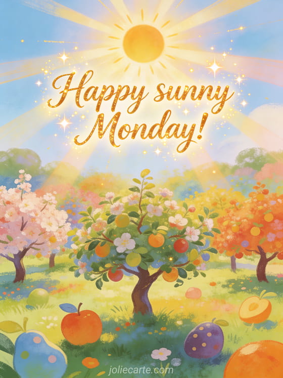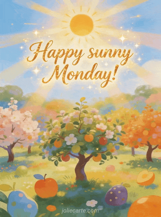 Send a bright happy sunny Monday greeting with a brilliant sun above a colorful orchard. Discover also monday kisses images, funny happy Monday humor or happy Monday cat kisses image.
