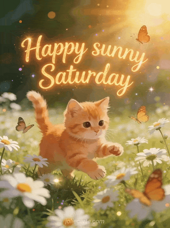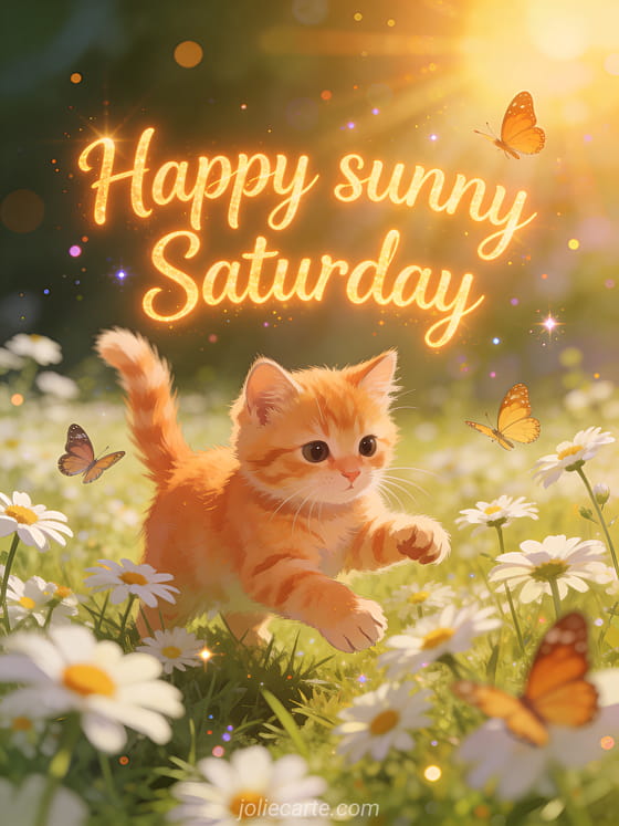 Share a bright happy sunny Saturday greeting with an adorable orange kitten playing in a field of daisies while butterflies fly around. Discover also a happy Saturday my friends image, an animated image happy saturday or a happy saturday everyone gif.