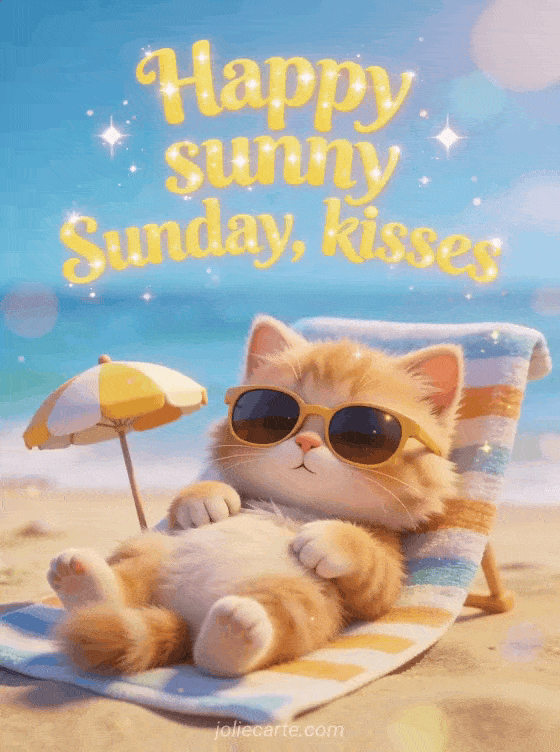 Share a playful sunny Sunday greeting with an adorable ginger kitten in sunglasses lounging on a beach towel, a tiny umbrella, and bright summer vibes. Discover also happy sunny Sunday image or happy Sunday card gif.