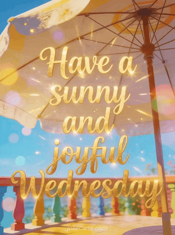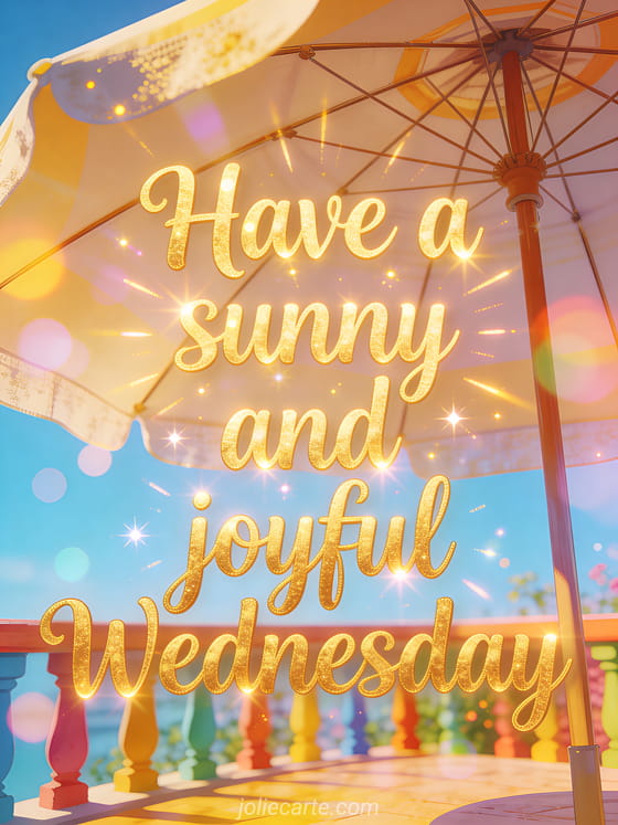 Wish a sunny and joyful Wednesday with golden script, radiant glow, an open parasol on a colorful terrace, lens flare, sparkling bokeh, and an uplifting mood. Discover also happy wednesday kisses card, text to wish a happy Wednesday, or happy Wednesday with animals.