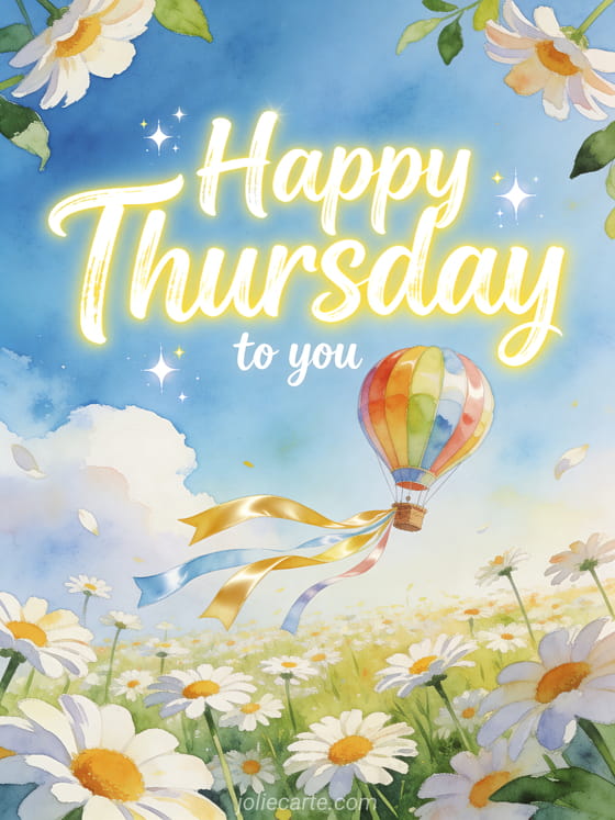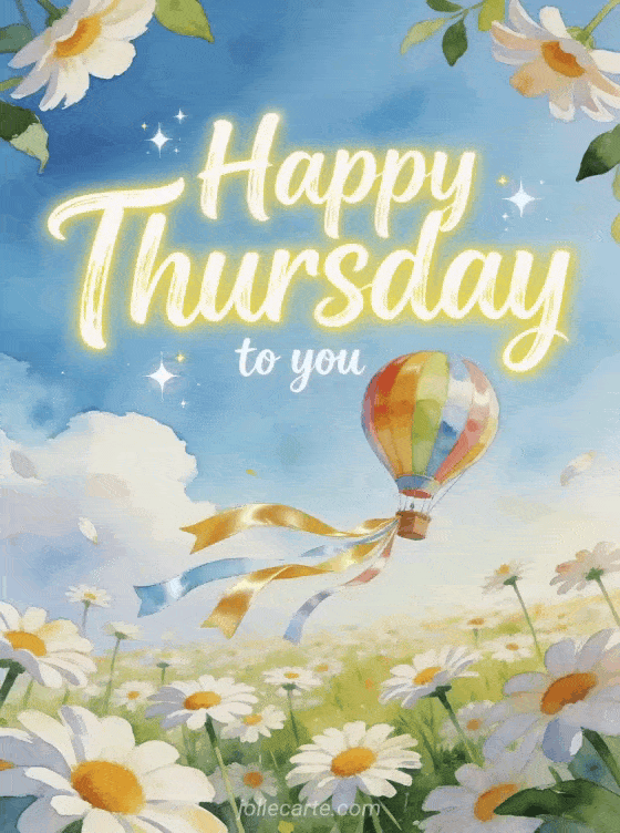Send happy thursday to you with sunny yellow lettering, a colorful hot air balloon, daisies and ribbons above a bright meadow. Discover also happy Thursday hearts images, happy thursday sun image or red happy Thursday gif.