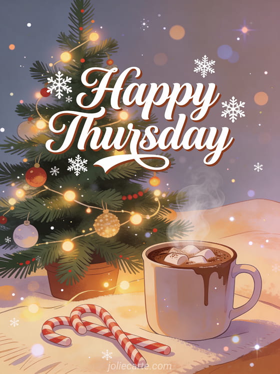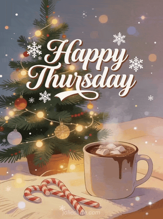 Send a magical happy Thursday greeting with festive lettering, hot chocolate, candy canes and a decorated Christmas tree with twinkling lights. Discover also a happy Thursday in the rain gif, free happy thursday images or a good morning happy Thursday image.