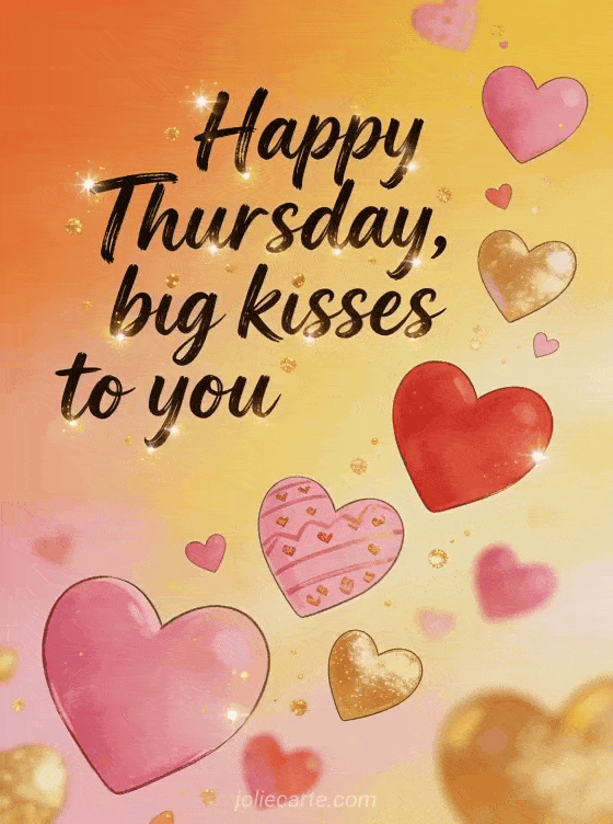Share big Thursday kisses with lively brush script, sparkling glow, oversized hearts drifting through golden light, vibrant gradients, and an affectionate mood. Discover also Thursday kisses gifs, happy thursday before christmas, or happy Thursday in the rain gif.