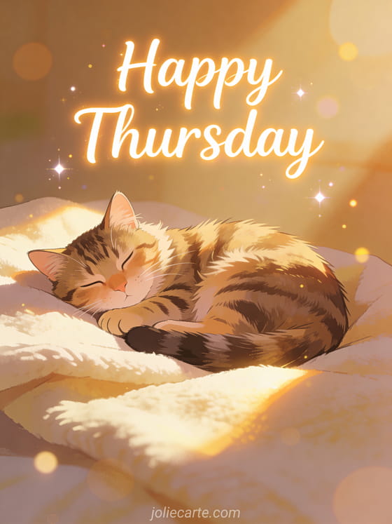 Share happy thursday cat with a fluffy tabby resting in a sunny patch on a soft blanket, looking content and sleepy. Send more calm wishes with good day Thursday card, happy Thursday message or positive happy thursday quote.