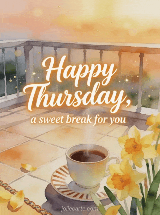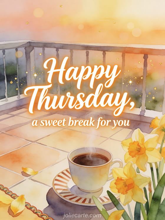 Share a sweet Thursday break with a steaming coffee cup on a tiled terrace, bright daffodils and cozy sunrise colors. Discover also happy Thursday friends image, happy thursday morning images or good morning Thursday quote.
