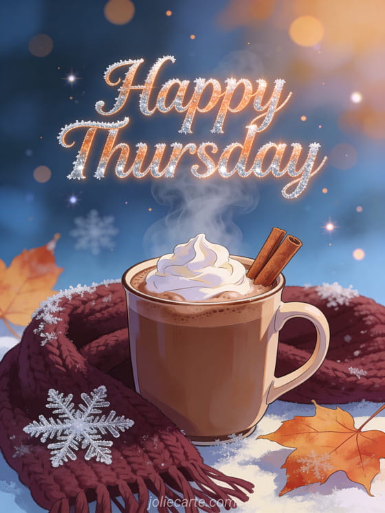 Warm up a cold Thursday with this cozy card featuring a steaming hot chocolate mug with cinnamon sticks and frost crystals on autumn leaves. Discover also a happy thursday photo or a have a nice thursday card.