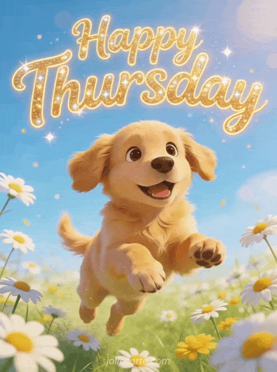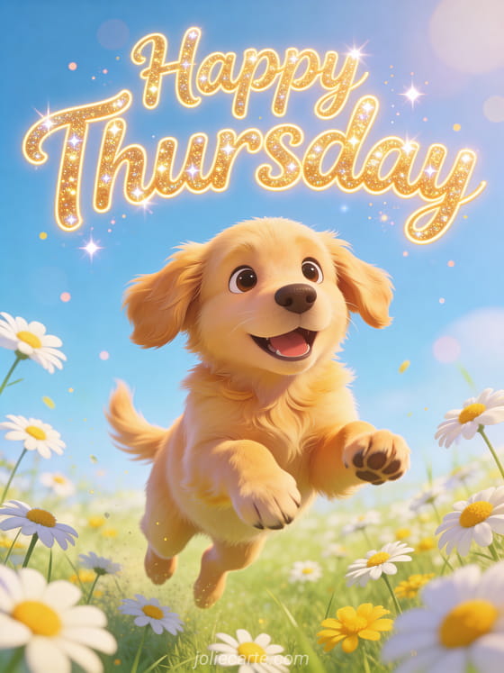 Send a joyful happy Thursday greeting with a playful golden retriever puppy jumping through a field of daisies in a bright cheerful atmosphere. Discover also happy rainy Thursday gif, good morning happy thursday sport image or cards to wish a happy Thursday.