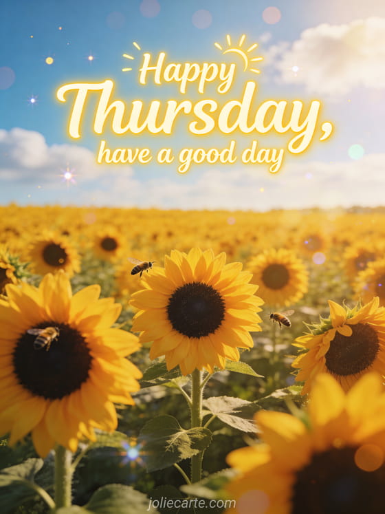 Share happy thursday have a good day with a cheerful sunflower field stretching toward a blue sky and fluffy clouds. Brighten more moments with hot happy Thursday image, good thursday images or beautiful happy Thursday image.