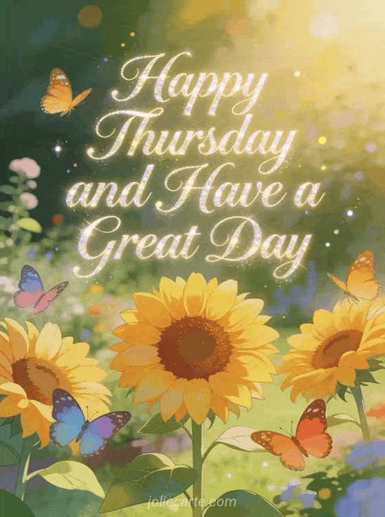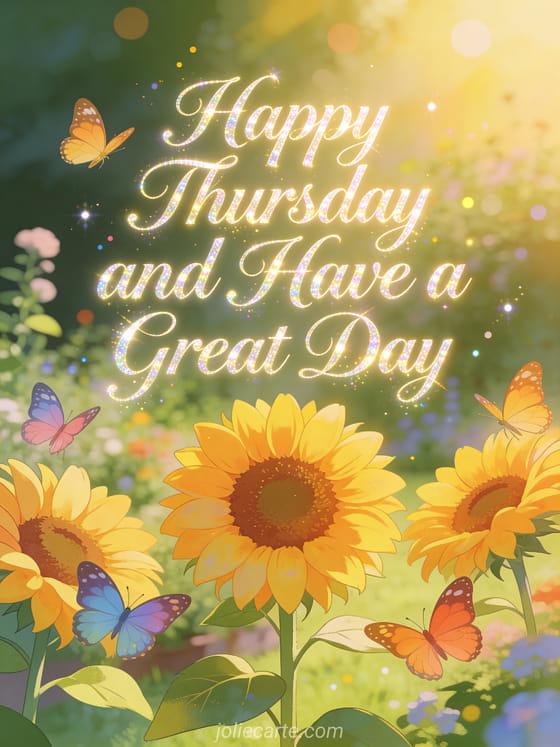 Brighten someone's Thursday with this colorful card featuring butterflies dancing around sunflowers in golden morning light. Discover also a happy rainy Thursday card, a happy Thursday minion gif card or a happy Thursday free images card.
