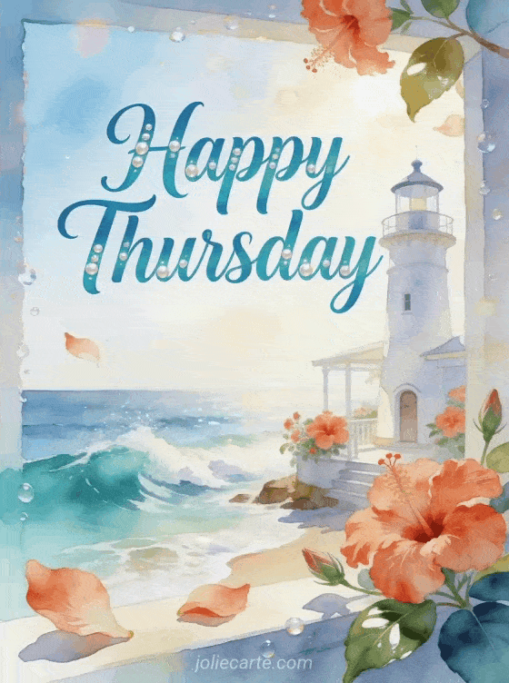 Send happy Thursday with ocean blue script, a bright seaside nook, a white lighthouse, coral hibiscus flowers and turquoise waves. Discover also sparkling happy thursday image, good morning happy Thursday animated gif or happy thursday gifs.