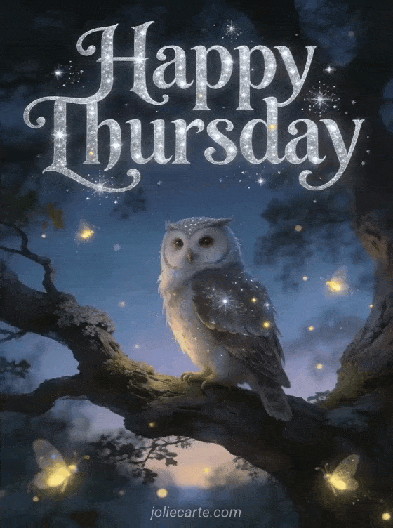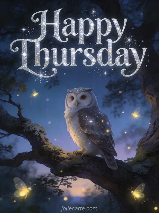 Share a happy Thursday full of enchanted forest charm with this glowing owl card. Discover also happy thursday images, happy sunny thursday or good thursday evening.