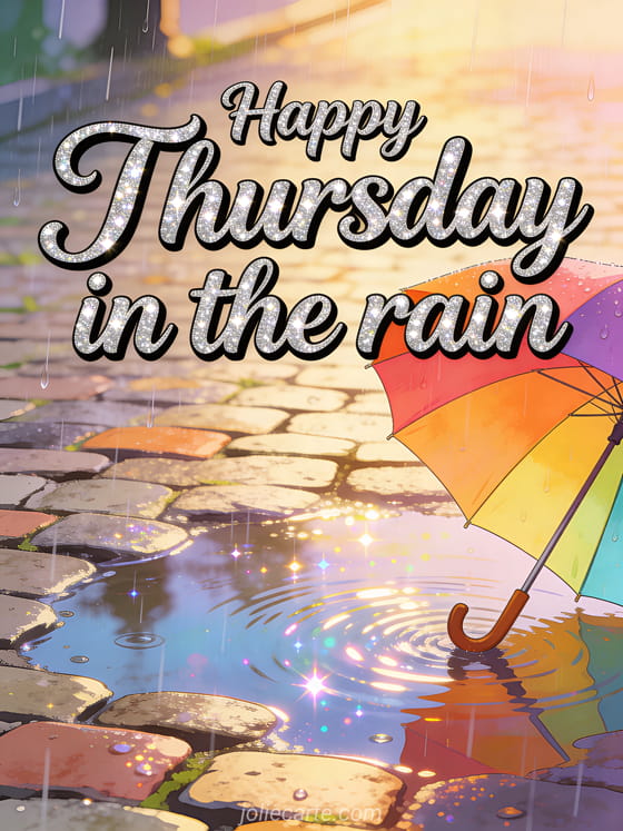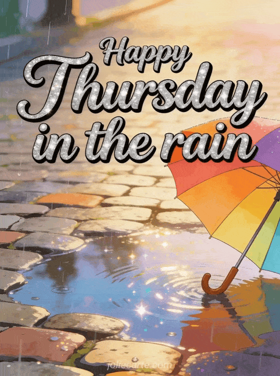 Share a happy Thursday in the rain with bold cursive, silver sparkle, a colorful umbrella beside shimmering puddles, rainy cobblestones, and warm ambient light. Discover also free happy thursday images, good morning happy Thursday image, or good morning happy Thursday kisses images.