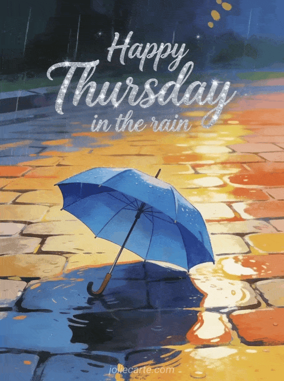 Share a happy Thursday in the rain image with silver cursive text, a blue umbrella on wet cobblestones and bright reflections. You can also send happy thursday kisses animated gifs, a happy thursday pretty card or good morning happy thursday.