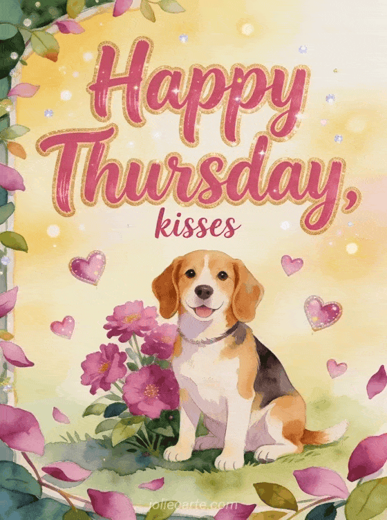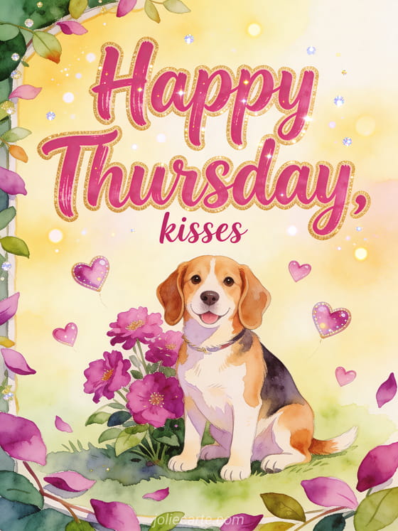 Share happy Thursday kisses with a cheerful beagle in a bright garden corner, fuchsia flowers and floating heart ornaments. Discover also happy thursday animated gif, happy Thursday hearts images or happy thursday sun image.