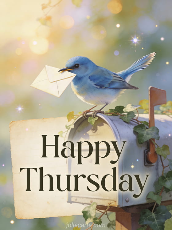 Wish someone a happy Thursday with this charming vintage-style card. A bluebird carries a tiny envelope perched on a mailbox covered in ivy in a nostalgic heartfelt atmosphere. Discover also a happy Thursday card or a funny Thursday humor card.