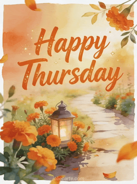 Send a joyful happy Thursday greeting with warm coral brush lettering, golden sparkles, a fresh morning garden path, marigolds, a small lantern and soft golden light. You can also share a good morning Thursday quote, a happy thursday animated image or good morning happy Thursday kisses images.