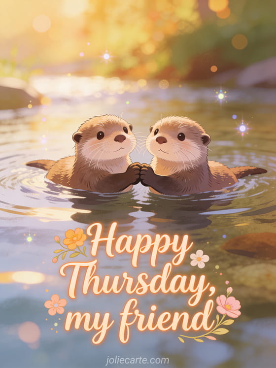 Share happy thursday my friend with two adorable otters floating together and holding paws in a peaceful river at golden hour. Send more friendly wishes with happy Thursday images, thursday have a good day or beautiful image to say happy Thursday.
