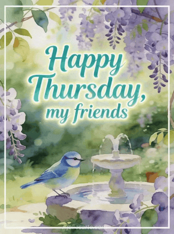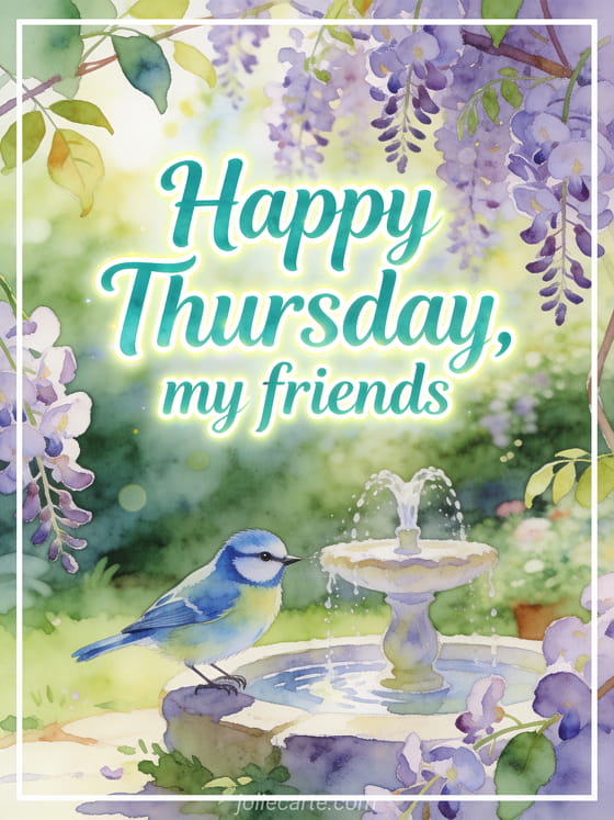 Send a friendly happy Thursday greeting to friends with teal watercolor lettering, a blue tit perched near a small fountain, blooming wisteria, fresh green light and a sunny garden. You can also share a happy Thursday friends poem, a happy thursday image gif or a sparkling happy thursday image.