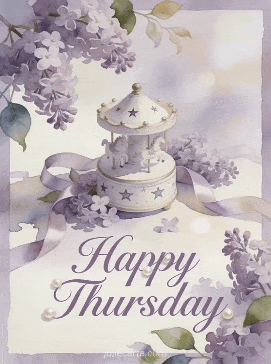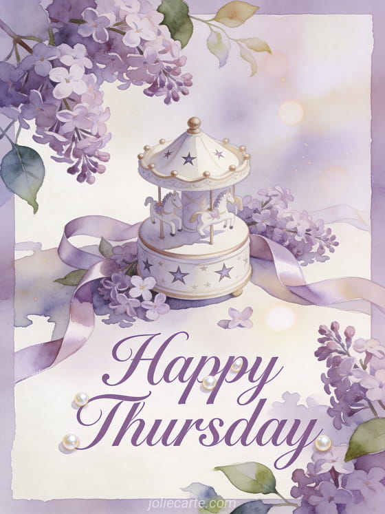 Wish a happy Thursday with a porcelain music box, star patterns, lilac blossoms and satin ribbons in soft pastel watercolor light. Discover also happy Thursday rain, good morning happy Thursday and good day or happy Thursday flower images.
