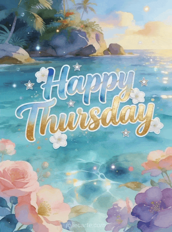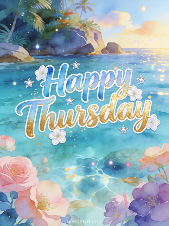 Send a happy thursday pretty card with pastel blue and golden watercolor letters, sparkling stars and white flowers over a turquoise paradise bay. Share an enchanting weekday wish and discover also happy thursday gif, happy rainy Thursday gif or good morning happy thursday sport image.
