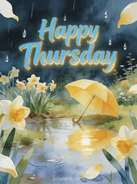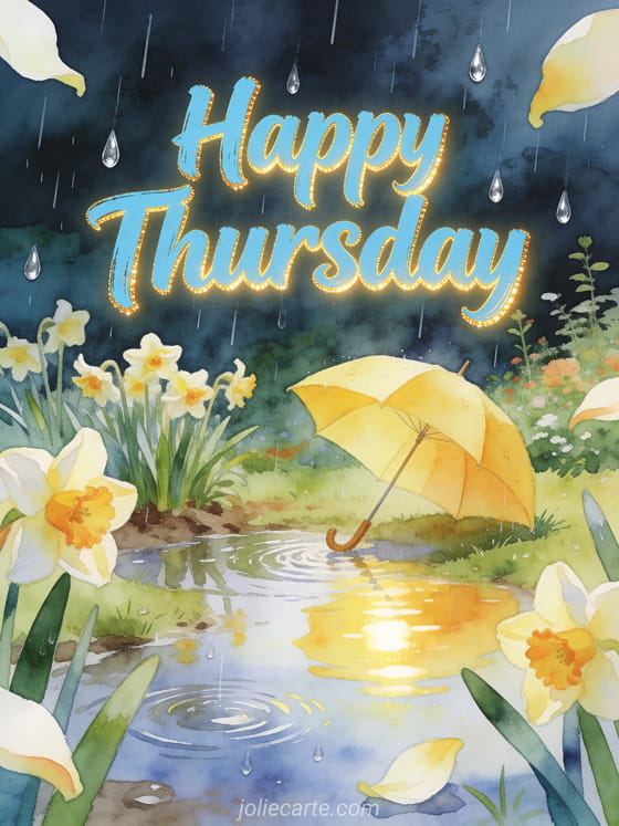 Share a happy Thursday in a cheerful rainy garden, with narcissus flowers, a yellow umbrella, bright puddles and silver raindrops. Discover also good morning happy Thursday and good day, happy Thursday flower images or Thursday good morning images.