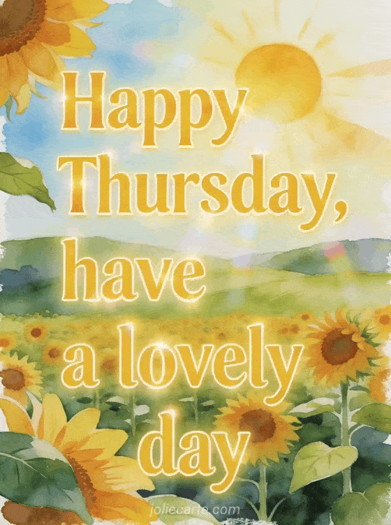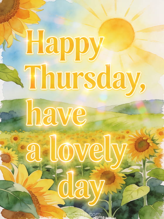 Send a radiant Thursday message with a bright sun over sunflowers and rolling green hills in watercolor. Discover also a red happy Thursday gif, a happy Thursday kisses animated gif or happy Thursday everyone images.