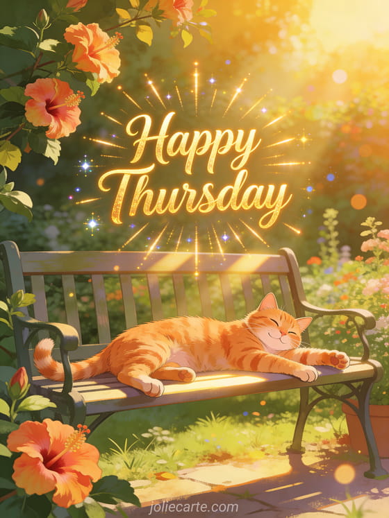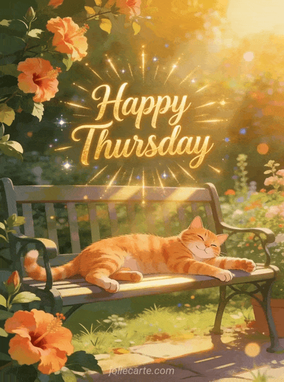 Brighten someone's Thursday with this sunny card featuring a cheerful ginger cat stretching in a sunbeam. See also gif happy thursday sunny or a good morning happy thursday have a great day card.