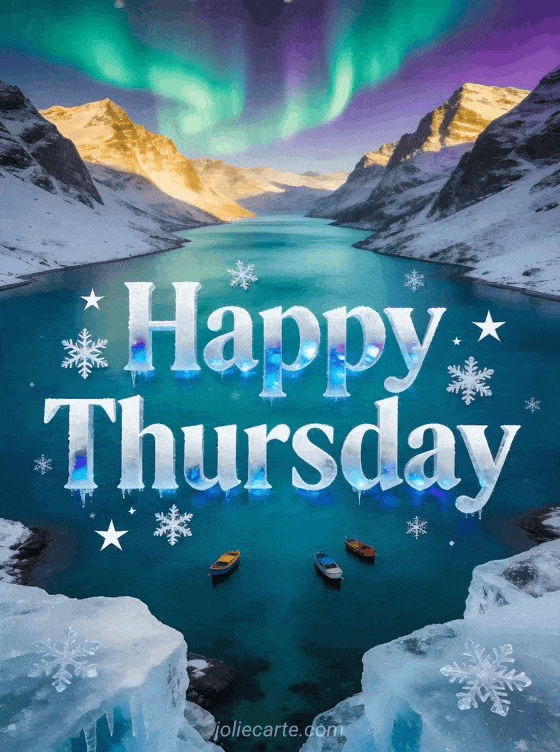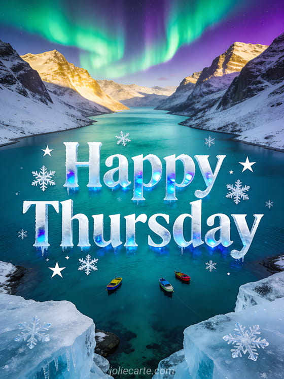 Share a panoramic happy thursday card with icy white lettering, arctic blue reflections, snowflakes, frosted stars, a turquoise fjord between snowy mountains, colorful boats on calm water and green and purple northern lights in the sky. See also happy thursday woman images, good morning thursday images or this image to wish a happy thursday.