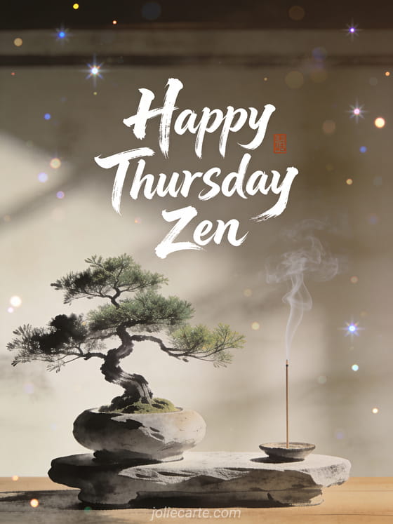 Share a minimalist Thursday greeting with a serene bonsai tree on a stone pedestal and gently rising incense smoke. Discover also a happy thursday courage or a beautiful thursday day card.