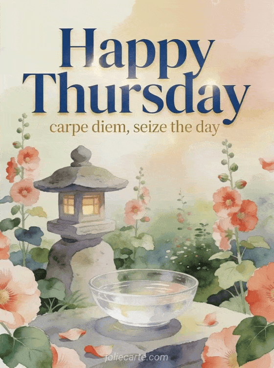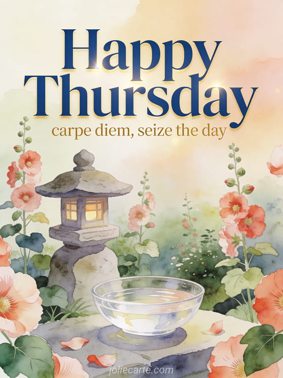 Share a calm happy Thursday with a peaceful watercolor garden, hollyhocks around a stone lantern and a clear water bowl. Discover also happy thursday text, happy thursday my friends images or happy Thursday friends poem.
