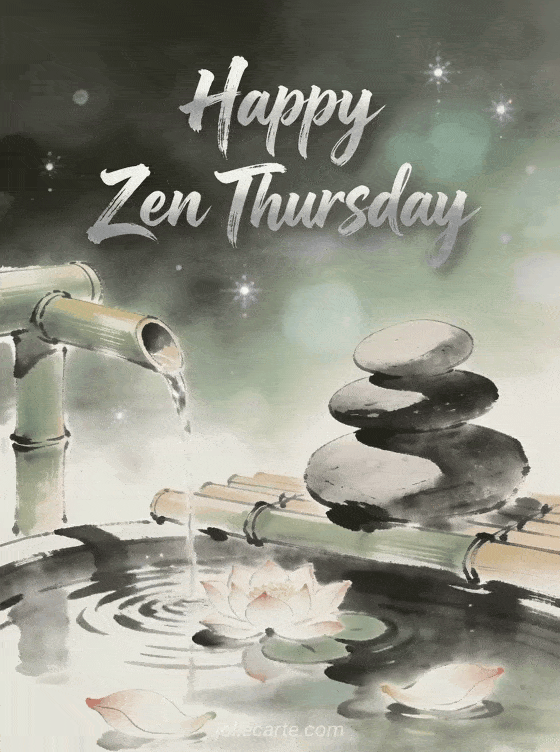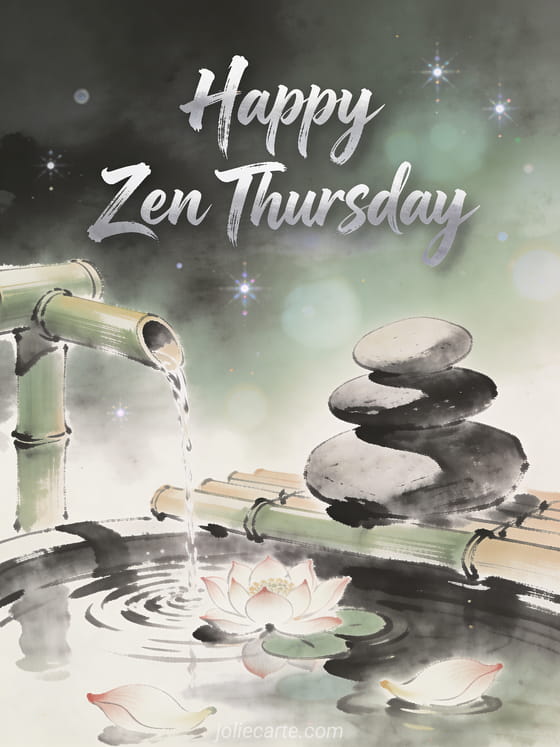 Share a tranquil Thursday greeting with zen stones, a bamboo water fountain and floating lotus petals. Discover also a great thursday or a thursday card.