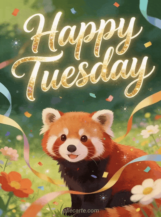 Share a happy Tuesday animals gif with playful calligraphy, a red panda in a festive meadow, streamers, flowers and colorful confetti. You can also send beautiful animated happy Tuesday images, a happy Tuesday rain image or happy Tuesday Facebook images.