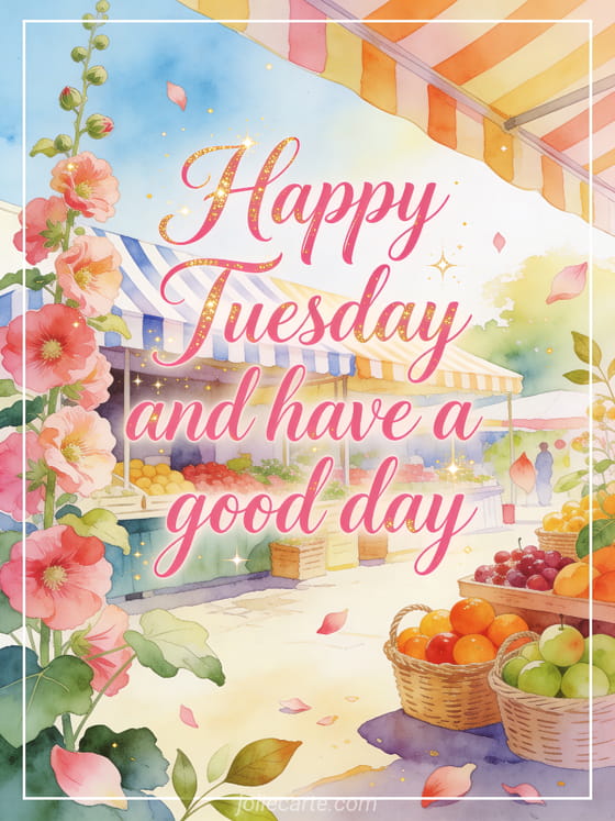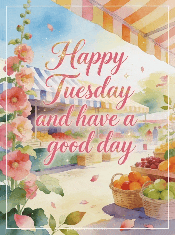Wish someone a happy Tuesday and a good day with a lively market stall, hollyhock flowers and bright fruit baskets. Discover also happy Tuesday my friends images, a free happy Tuesday image or happy tuesday animated gif funny.