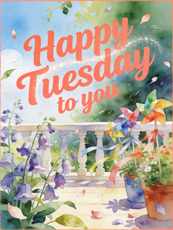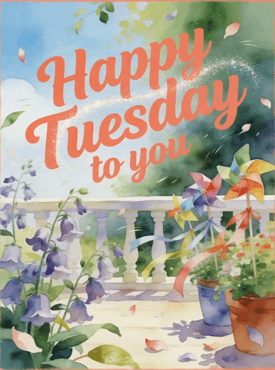 Share happy Tuesday to you with a bright watercolor terrace garden where bellflowers, colorful pinwheels, and fluttering ribbons bring cheerful motion. You can also send animated happy Tuesday kisses images, a happy tuesday kisses image, or a happy tuesday woman gif.