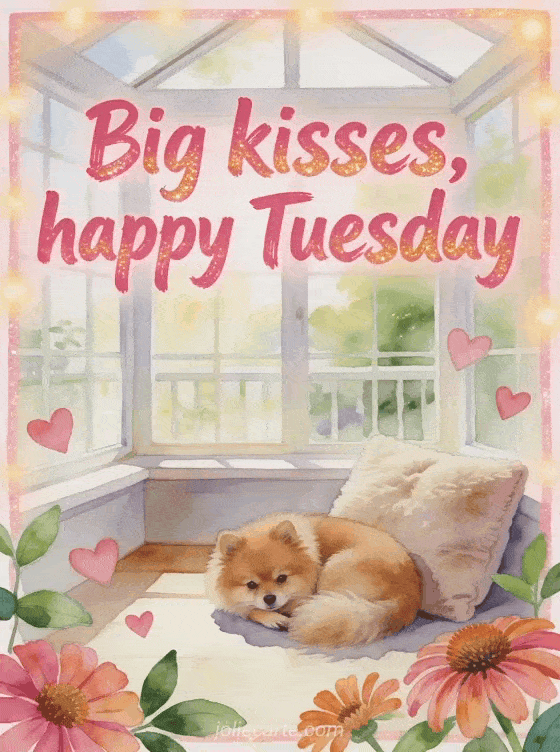 Send a tender happy Tuesday greeting with big kisses, a Pomeranian dog curled beside a plush cushion, painted hearts and zinnia petals in a sunny room. Discover also a good morning happy Tuesday kisses gif, happy Tuesday images or happy Tuesday cats gif.