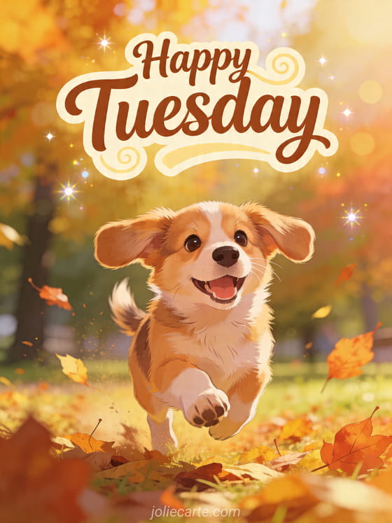 happy tuesday a playful tuesday greeting full of autumn leaves and puppy energy