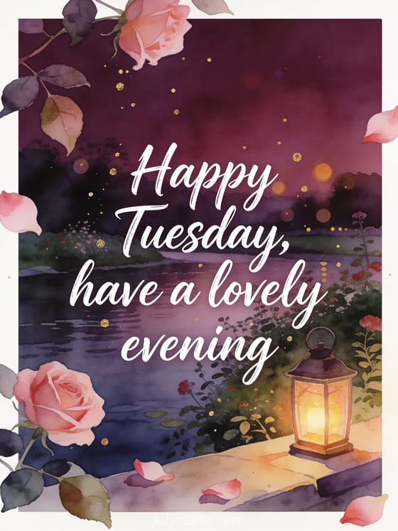 Share a peaceful happy Tuesday evening greeting with deep plum calligraphy and soft golden flecks. This free card shows pink rose petals, a glowing lantern and a calm riverside garden in warm twilight. Discover also a happy Tuesday with flowers image card, a card to wish a happy Tuesday or an image to wish a happy Tuesday.