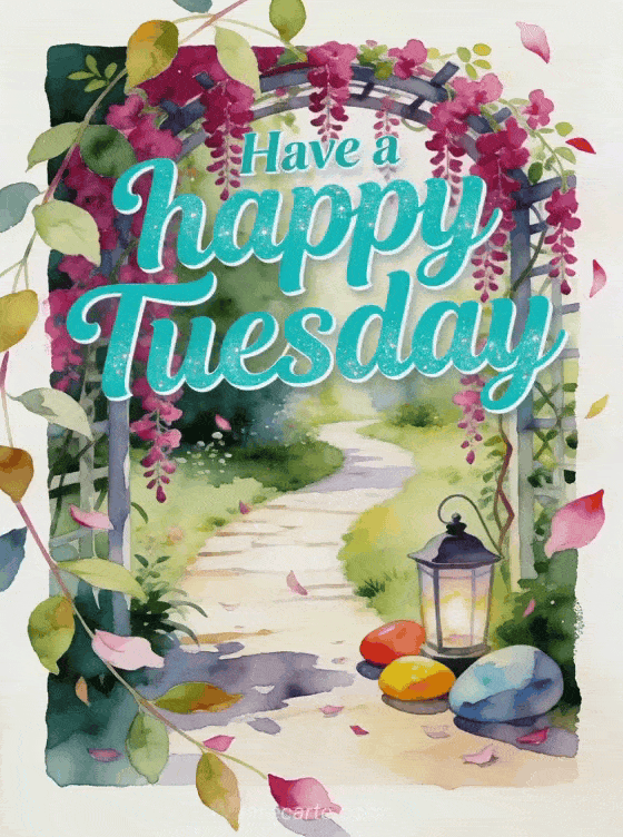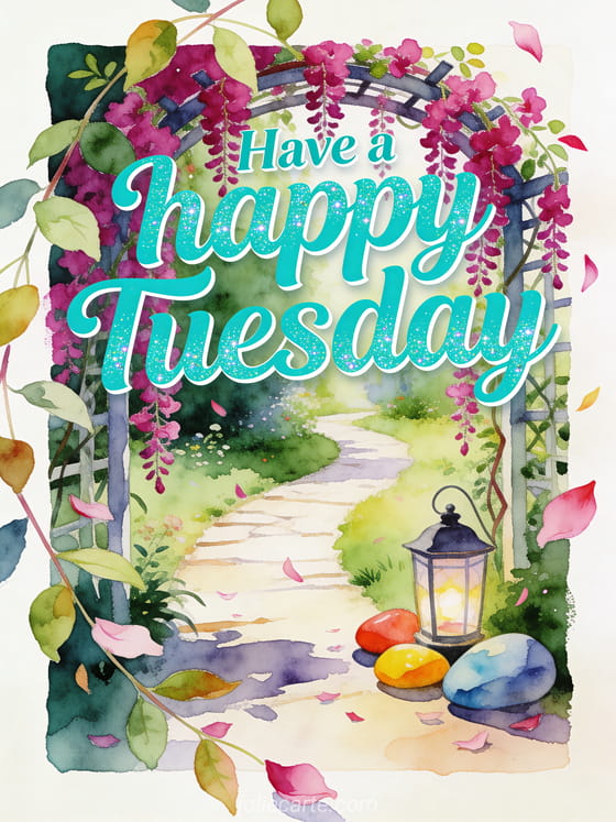 Brighten Tuesday with a watercolor garden path, fuchsia blossoms hanging from an arbor, a small lantern and cheerful sparkling color. You can also send happy Tuesday big kisses gif, share good morning happy Tuesday kisses gif or choose happy Tuesday images.