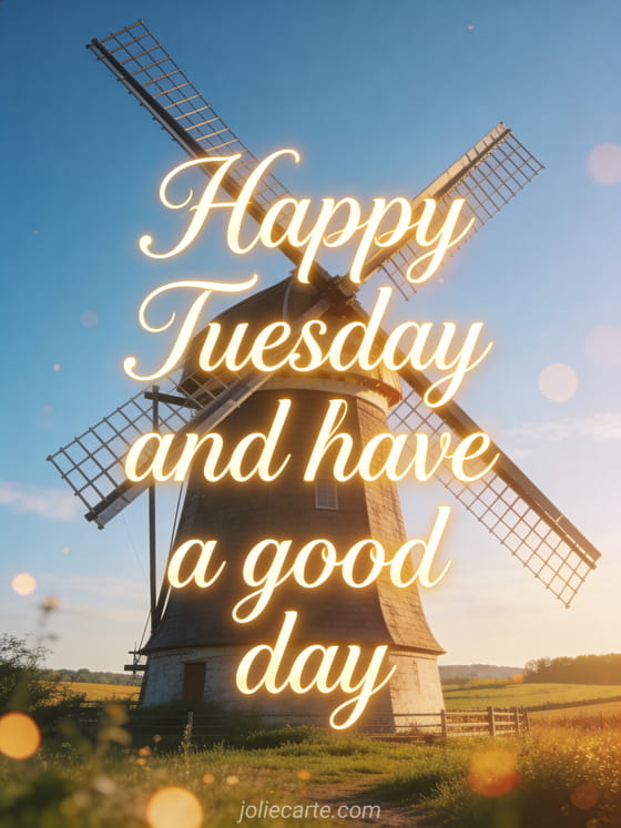 Share a happy Tuesday good day greeting with graceful golden script, a luminous countryside windmill, clear blue sky and warm cinematic light. Discover also happy Tuesday kisses gifs, a good morning happy Tuesday kisses image or happy Tuesday my friends gif.