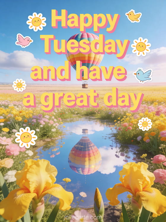Brighten someone's Tuesday with this cheerful greeting card featuring a hot air balloon over blooming fields. Discover also a great tuesday kisses card or a happy tuesday photo.
