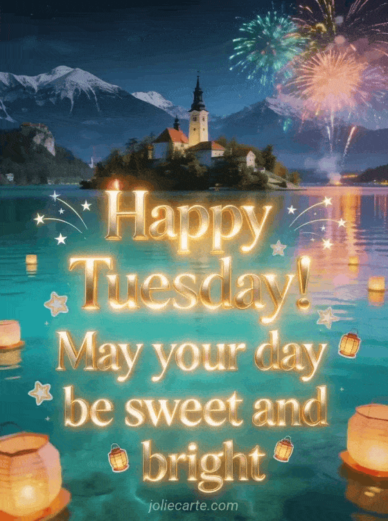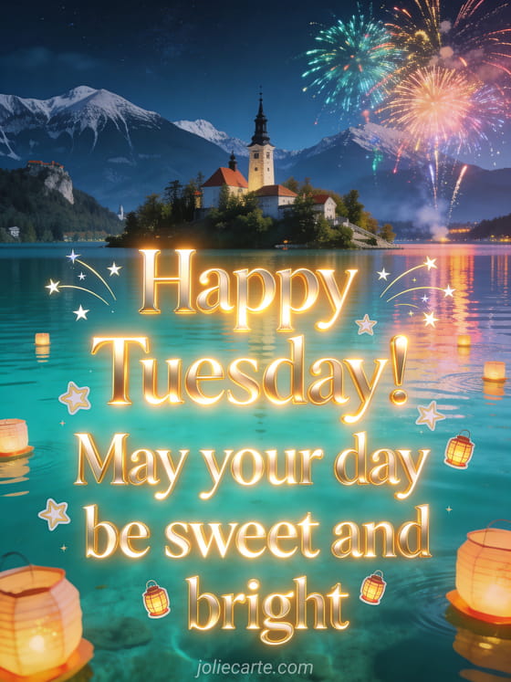 Brighten someone's Tuesday with this fairy-tale card featuring Lake Bled at night with fireworks and floating lanterns. Discover also a happy tuesday everyone card, a happy tuesday card or a have a nice day card.