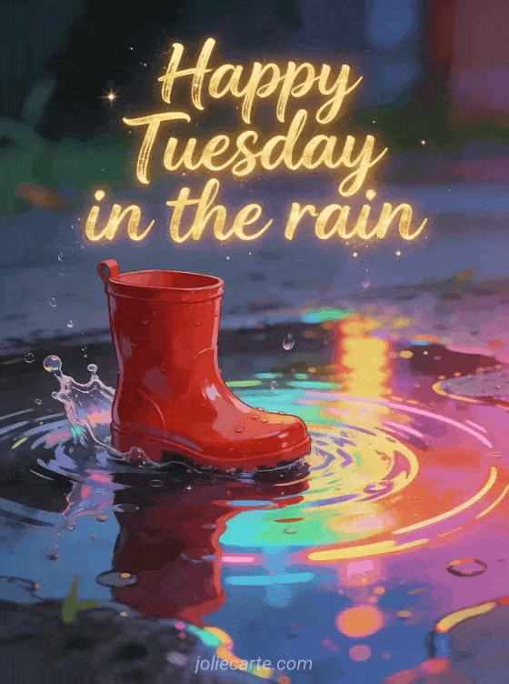 Share a happy Tuesday in the rain image with radiant lettering, a glossy rain boot beside lively puddles and sparkling droplets. You can also send happy Tuesday gifs, a happy Tuesday in the rain gif or a happy Tuesday butterfly gif.
