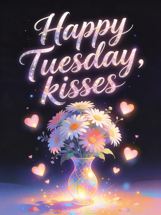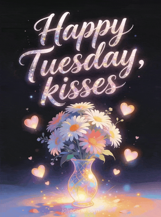 Share happy Tuesday kisses with flowing glittered script, a vivid aster bouquet in a radiant vase, floating heart lights and soft sparkles. Discover also happy tuesday good day gif, happy Tuesday kisses gifs or a good morning happy Tuesday kisses image.