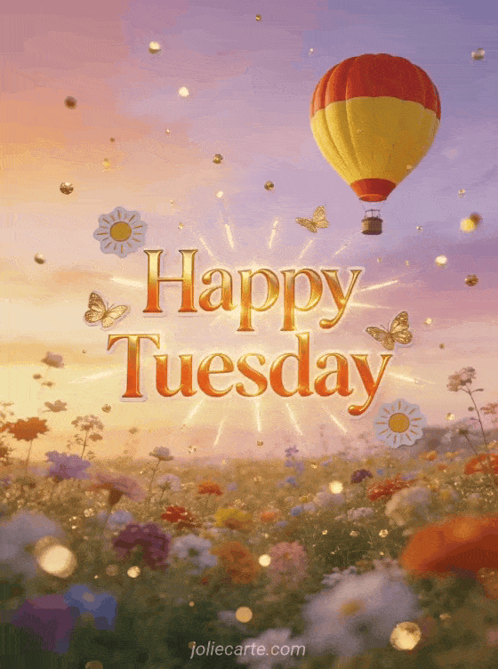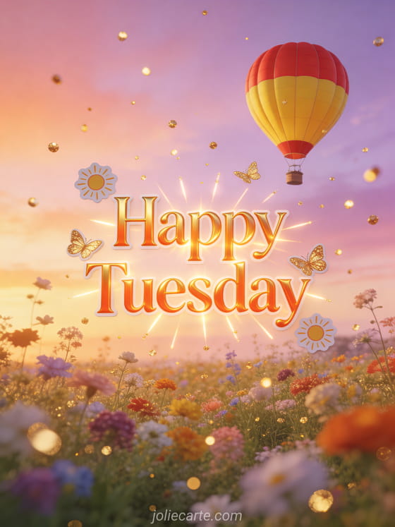 Send a warm Happy Tuesday card with golden orange letters, little suns, golden butterflies and a red and yellow hot air balloon floating above a multicolored flower field at pastel sunset. Discover also happy Tuesday landscape image, good Tuesday day gif or free happy Tuesday kisses images.